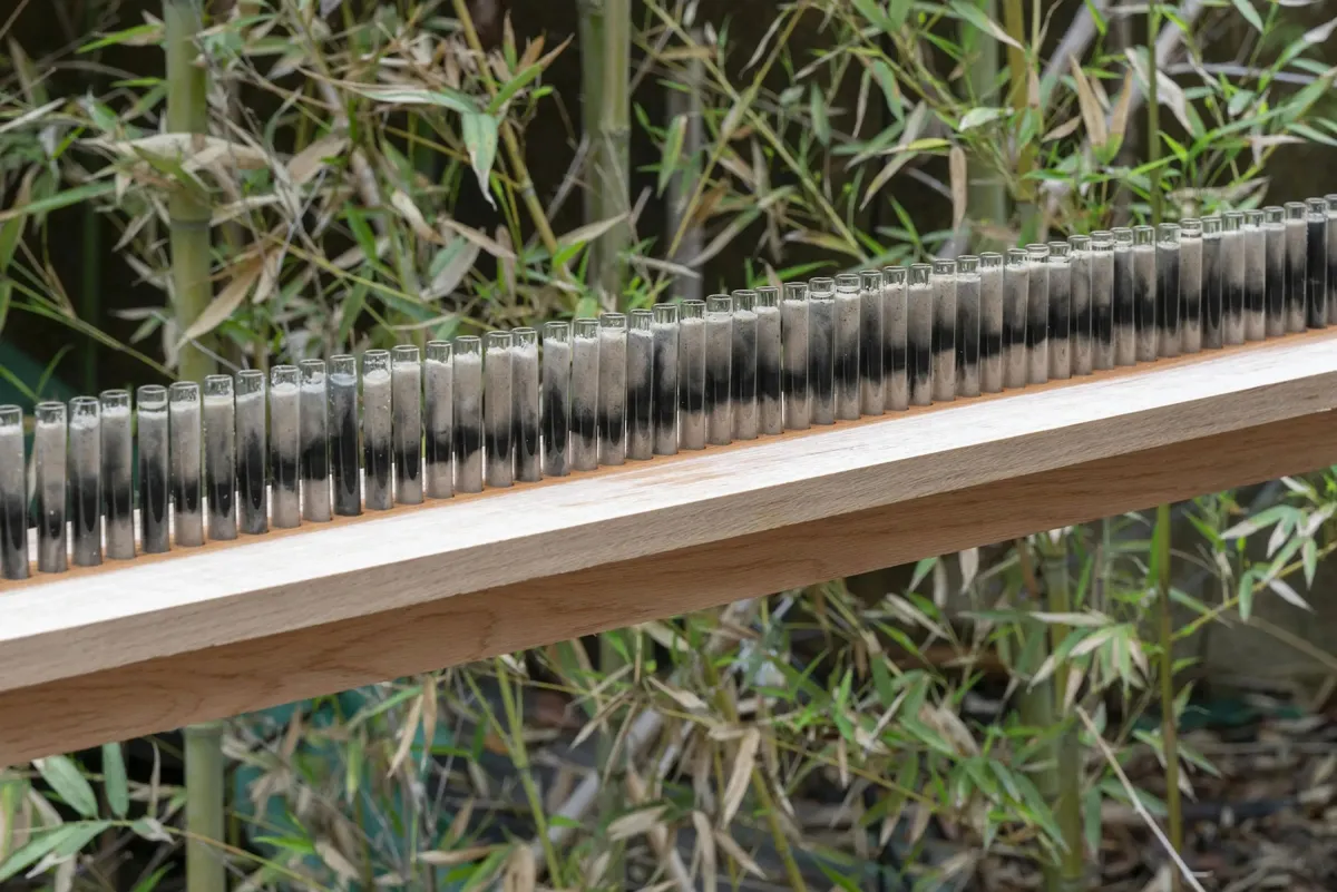 Abby Flanagan, rain score, 2024. Sand in glass tubes, wood table. Photo: Alex Boeschenstein.