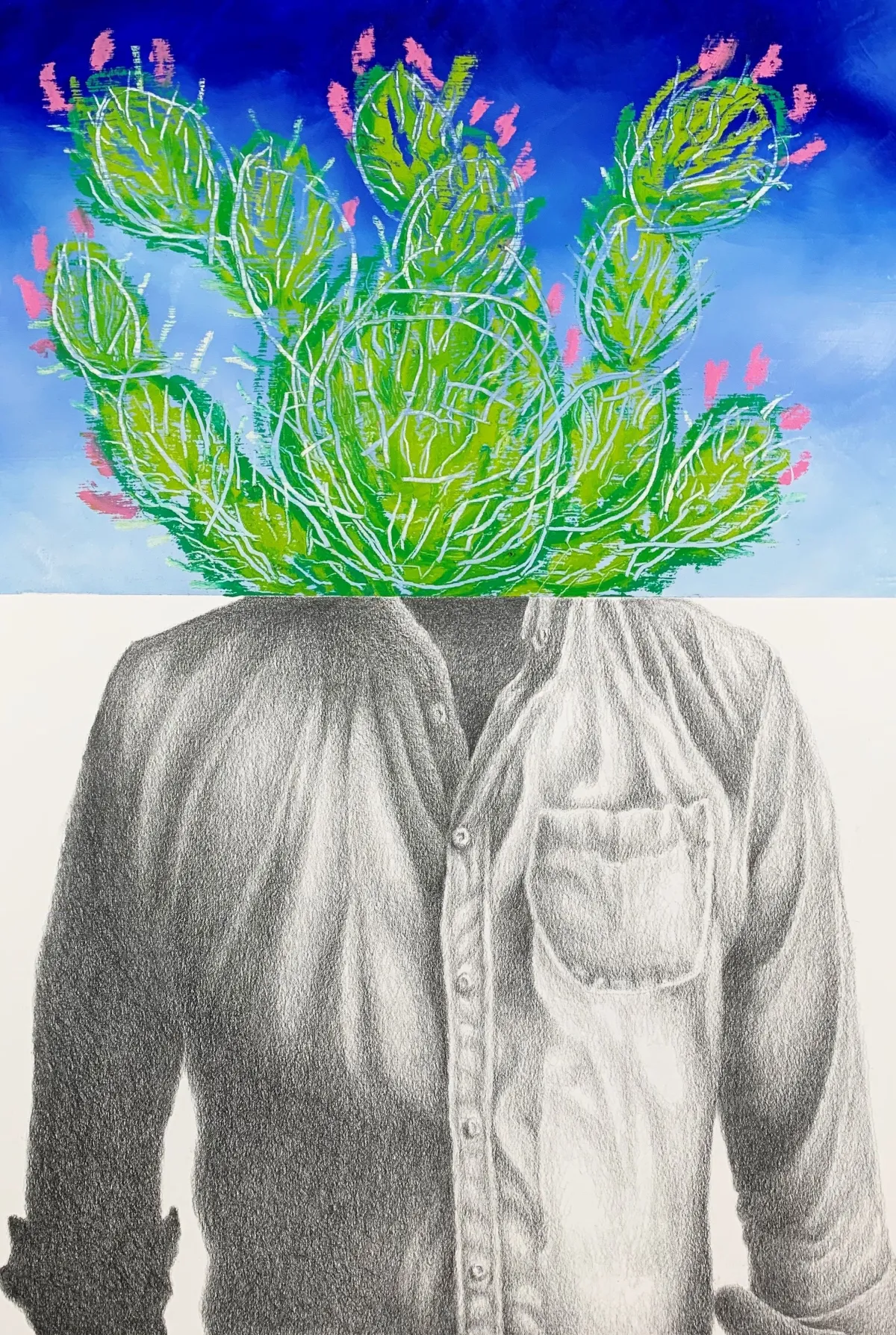 Alejandro Macias, Nopal en la Frente II, 2019. Oil, acrylic, and graphite on paper. 26 × 17.5 in. Courtesy of the artist.