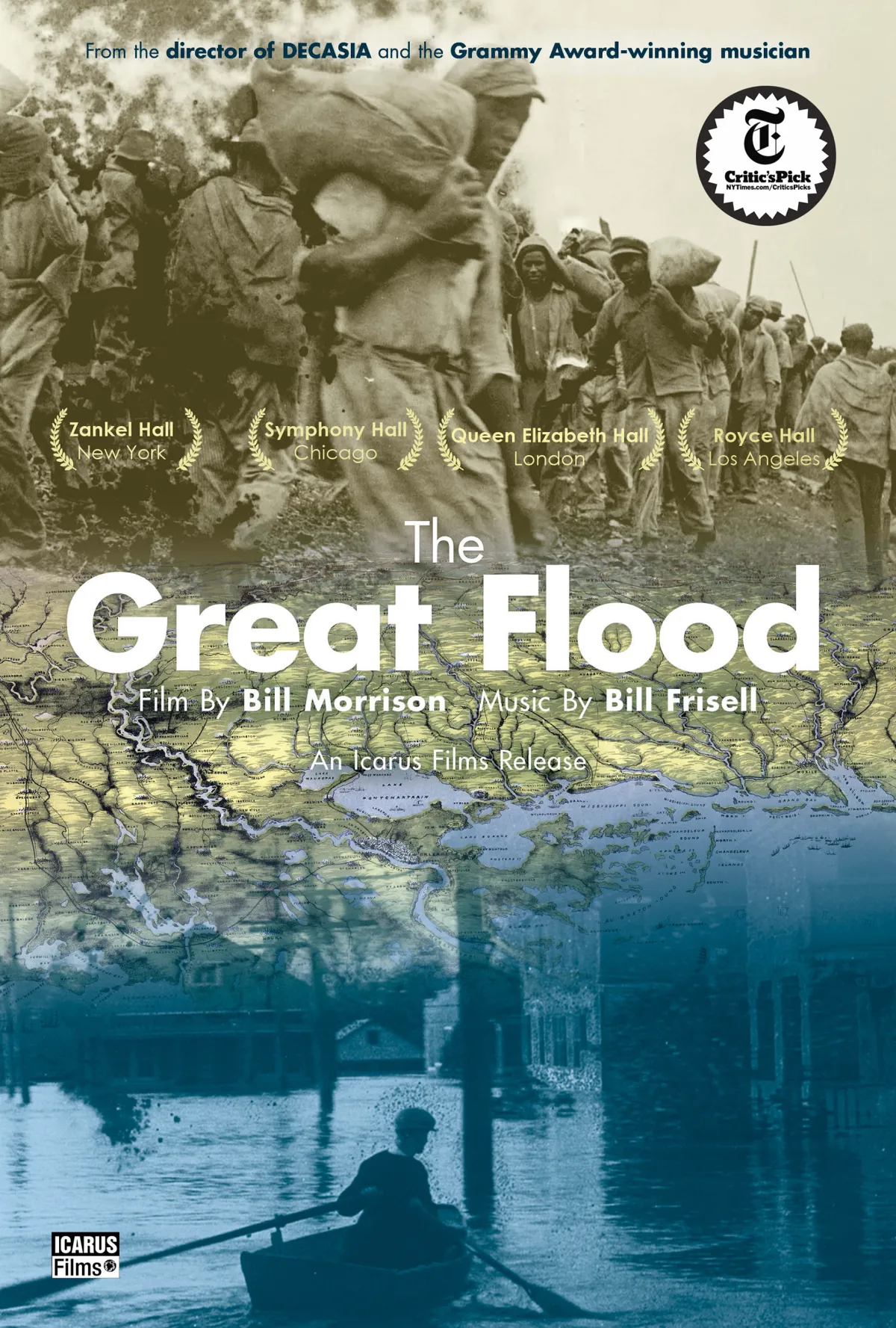 "[The Great Flood] would be a memorable drama even played in total silence. Guitarist Bill Frisell's live soundtrack of howling blues chords, Thelonious Monk hooks, country-swing and Old Man River quotes would make a fine concert without a film, too. Put the two together [and] the result moves up another creative and emotional level." — The Guardian