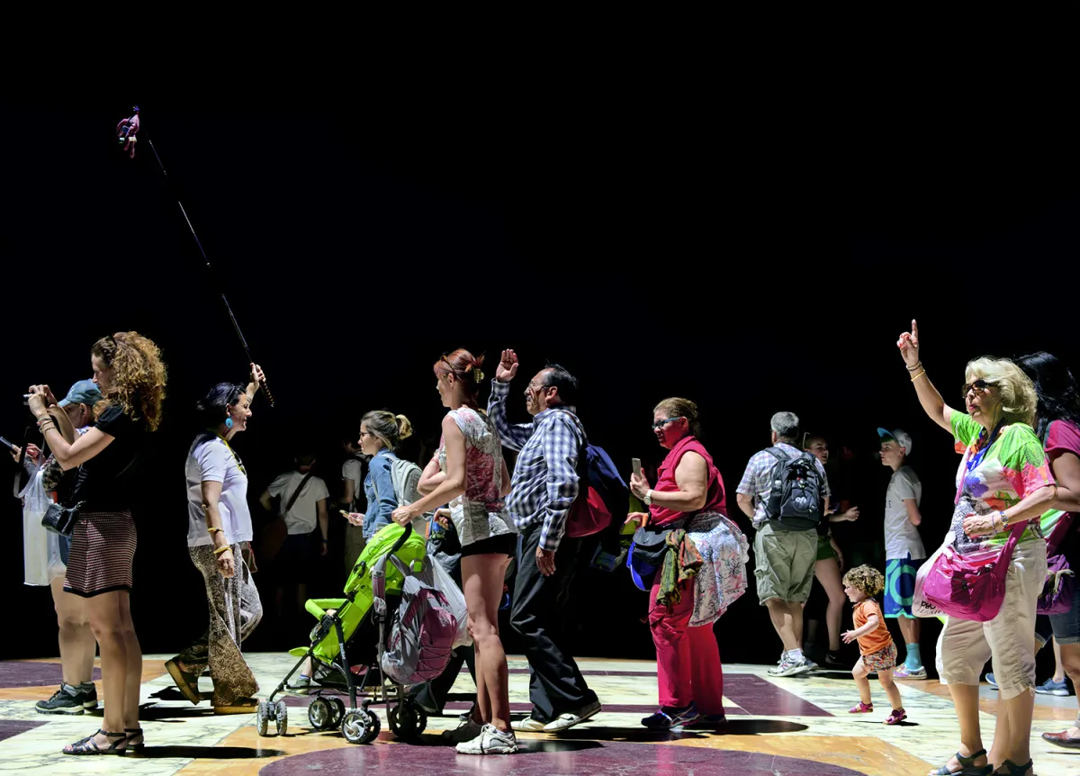 In Every God, vacationers crowd the Pantheon in Rome, gawking at their ancient surroundings. The harsh light from the temple’s oculus throws shadows across their faces and shrouds some of the group, making the temple seem like a theater. As tourists drawn by a desire to see, travelers often ignore the seductive institutions that bring them there. By turning her lens toward the camera-wielding throng, Bick does not.