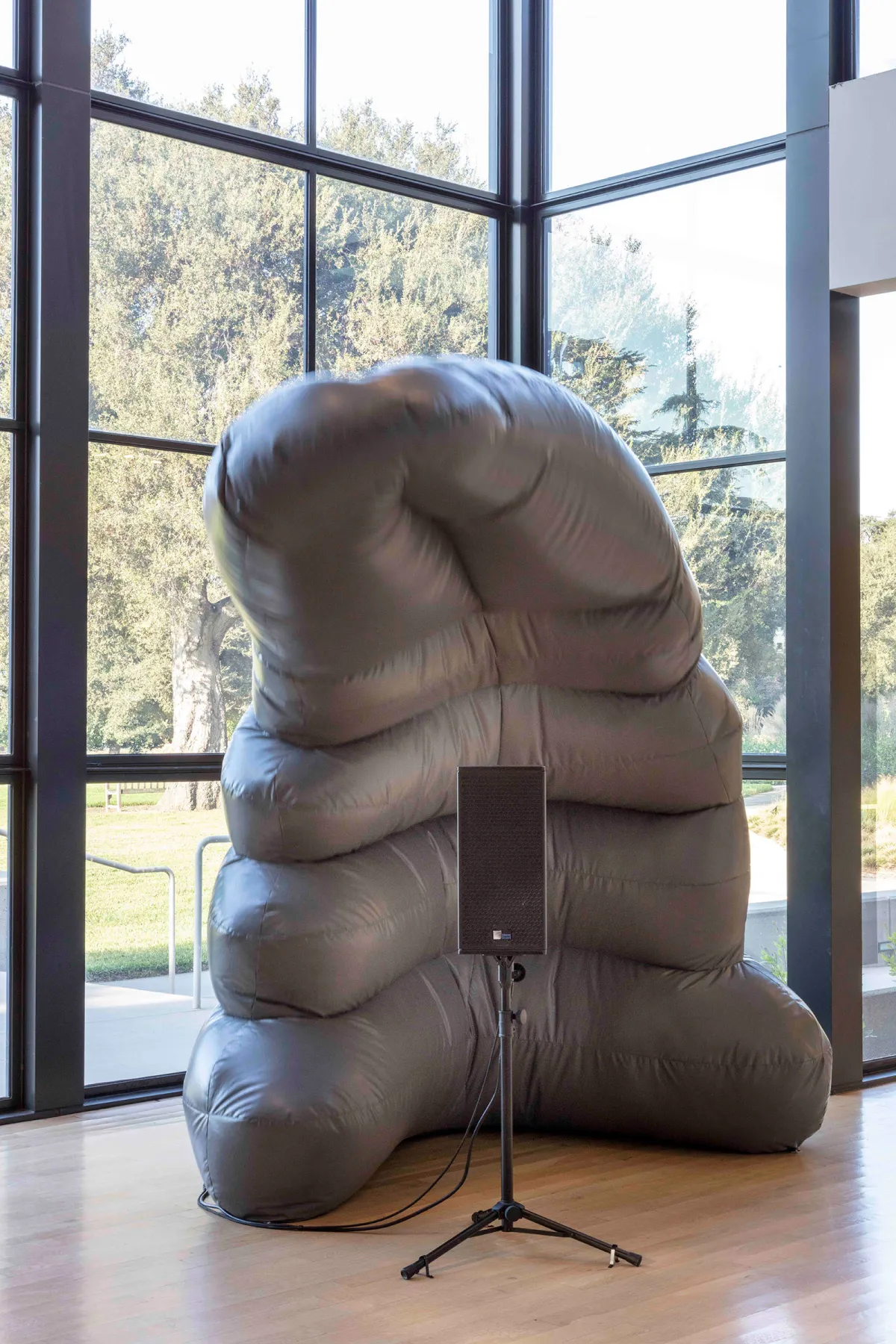 Jacqueline Kiyomi Gork, Variations in Mass #3, 2020. PCV tarpaulin inflatable walls, Arduino and mini triggers, air blower pump fan, speaker, sound. 135 × 100 × 95 in. (343 × 254 × 241.5 cm). Courtesy of the artist and François Ghebaly Gallery. Photo: Joshua White