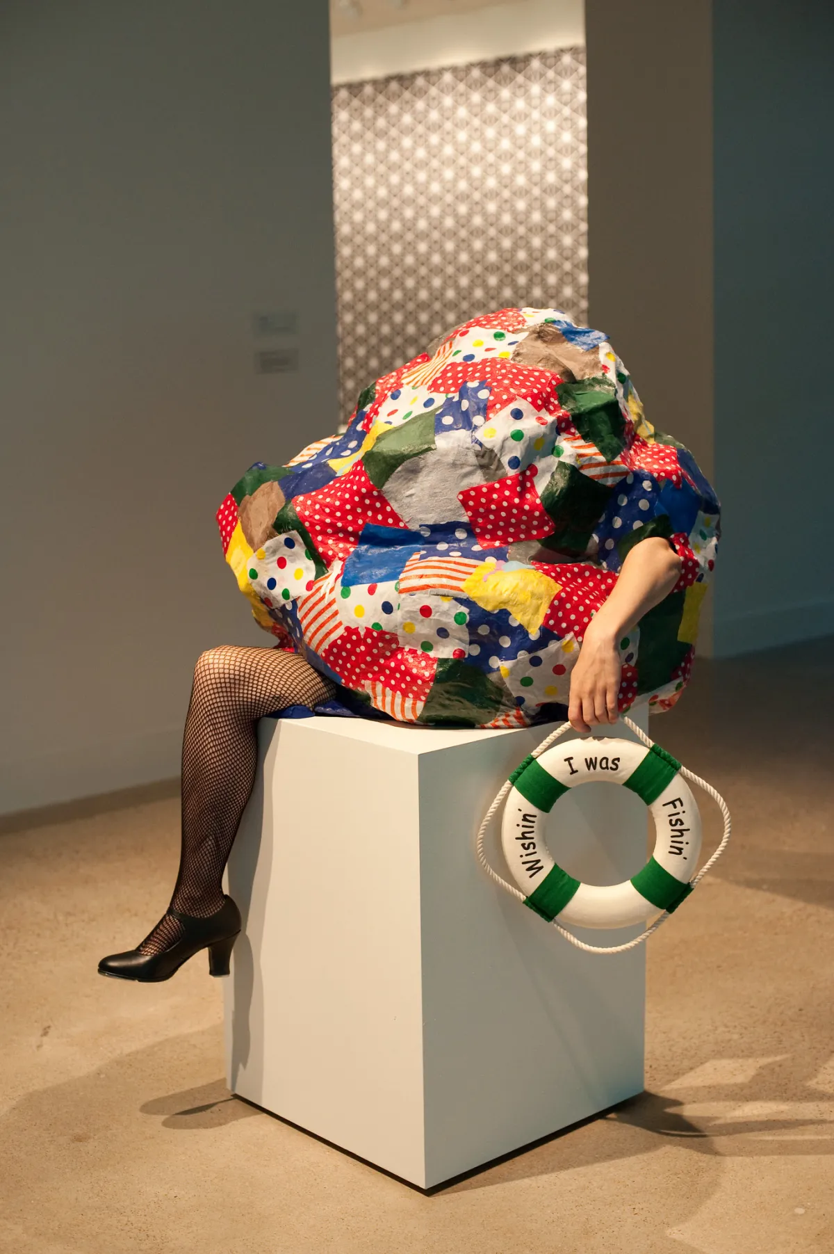 Jamie Isenstein, Dancing Pop-up Fishing Sculpture, 2010. Fabric, newspaper, glue, paint, "Worm in a Can" gag dinner mints, human leg, fishnet tights, tap shoe, or velvet curtain, human arm or velvet curtain, "Wishing I Was Fishing" or"Gone Fishing" life preservers, pedestal. Dimensions variable. Photo: Sandy Carson.