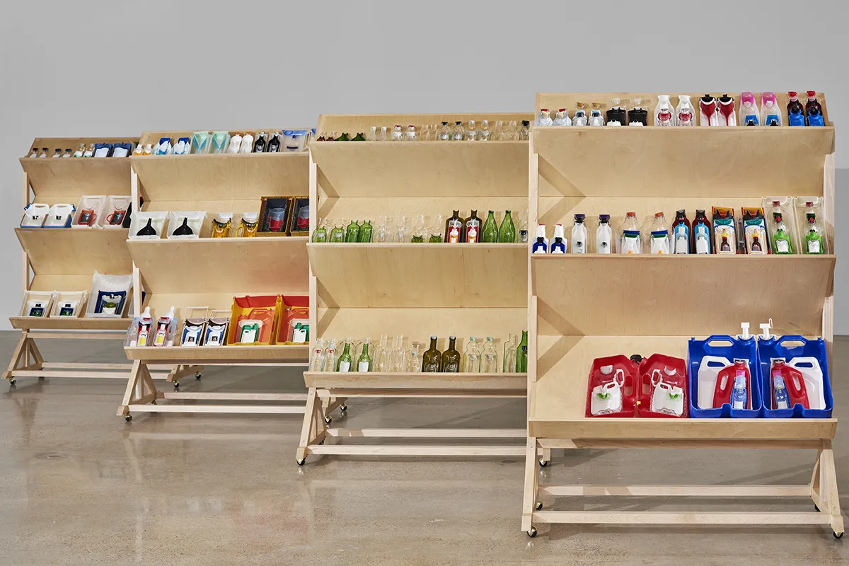 Lan Tuazon, No Nouns Left Whole, ongoing. Six wood shelves with ceramic, metal, glass, plastic, and organic containers. 30 × 48 × 72 in. each. Photo: Matthew Cronin.