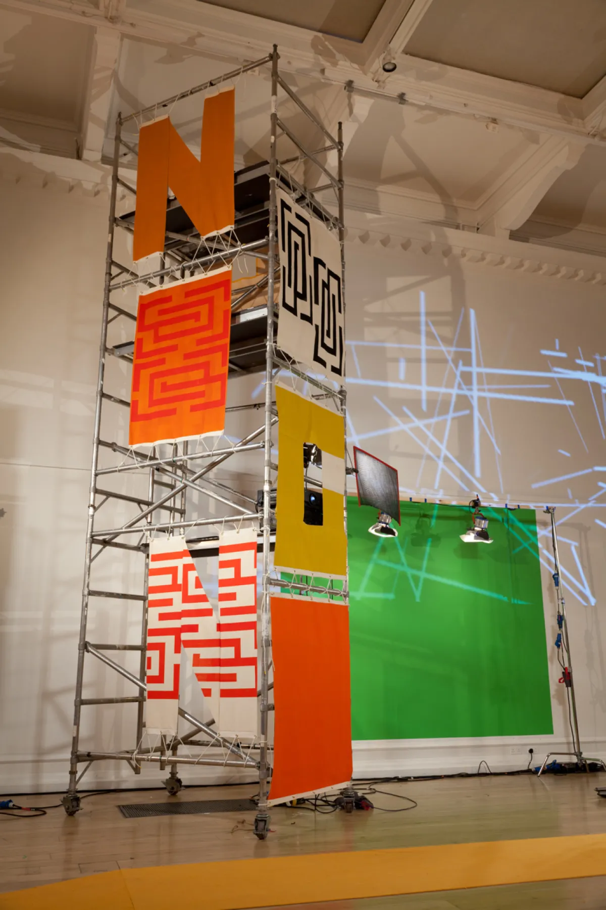 The Architect’s Garden is a new site-specific exhibition by New York-based artist Mika Tajima, the VAC’s fall artist-in-residence in the Vaulted Gallery. Tajima constructs sculptures that incorporate a framework of scaffolding holding canvas panels printed with a kaleidoscopic collage of images drawn from her interest in modernist designs, formal French gardens, Richard Linklater’s Slacker, and film and theater sets.