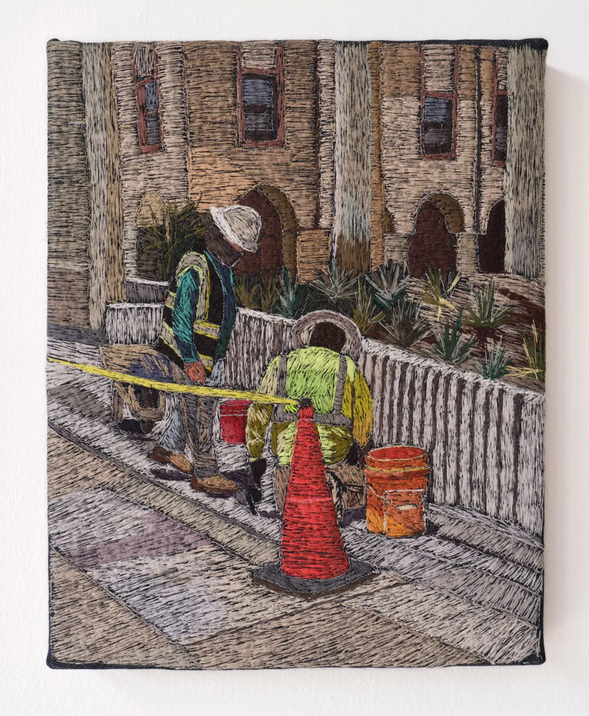 Erick Medel, Trabajadores at the Blanton (104º), 2023. Polyester thread on denim. Courtesy of Matthew and Melissa Diehl.