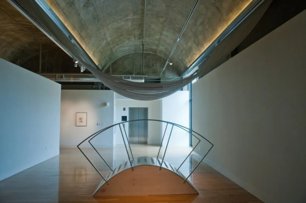 Amy Hauft, The Llano Uplift (installation view), 2013. Stainless steel ball chain, aluminum, wood, steel, hardware, and VAC’s concrete ceiling vault. 214 x 168 x 120 in. Photo: Sandy Carson.