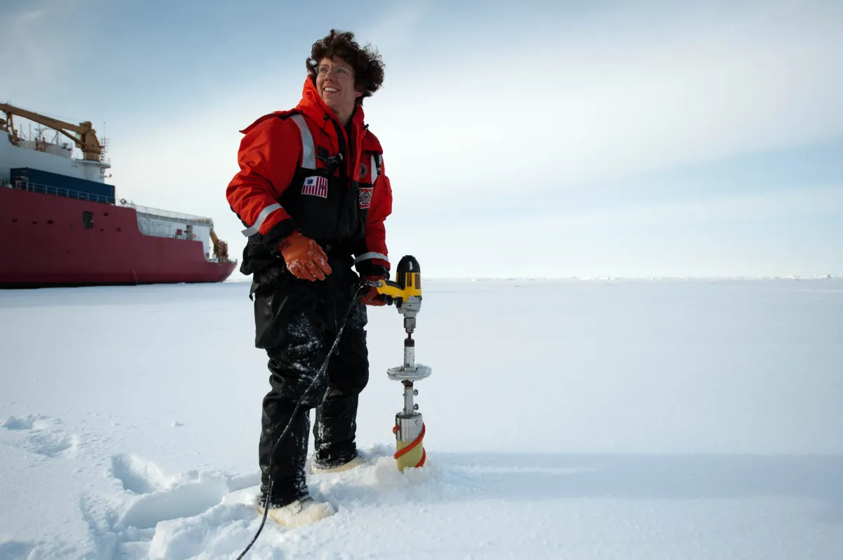 Chris Linder, Heloise Chenelot, a technician from the University of Alaska Fairbanks, takes ice cores with a corer that runs off an electric drill, 2009.