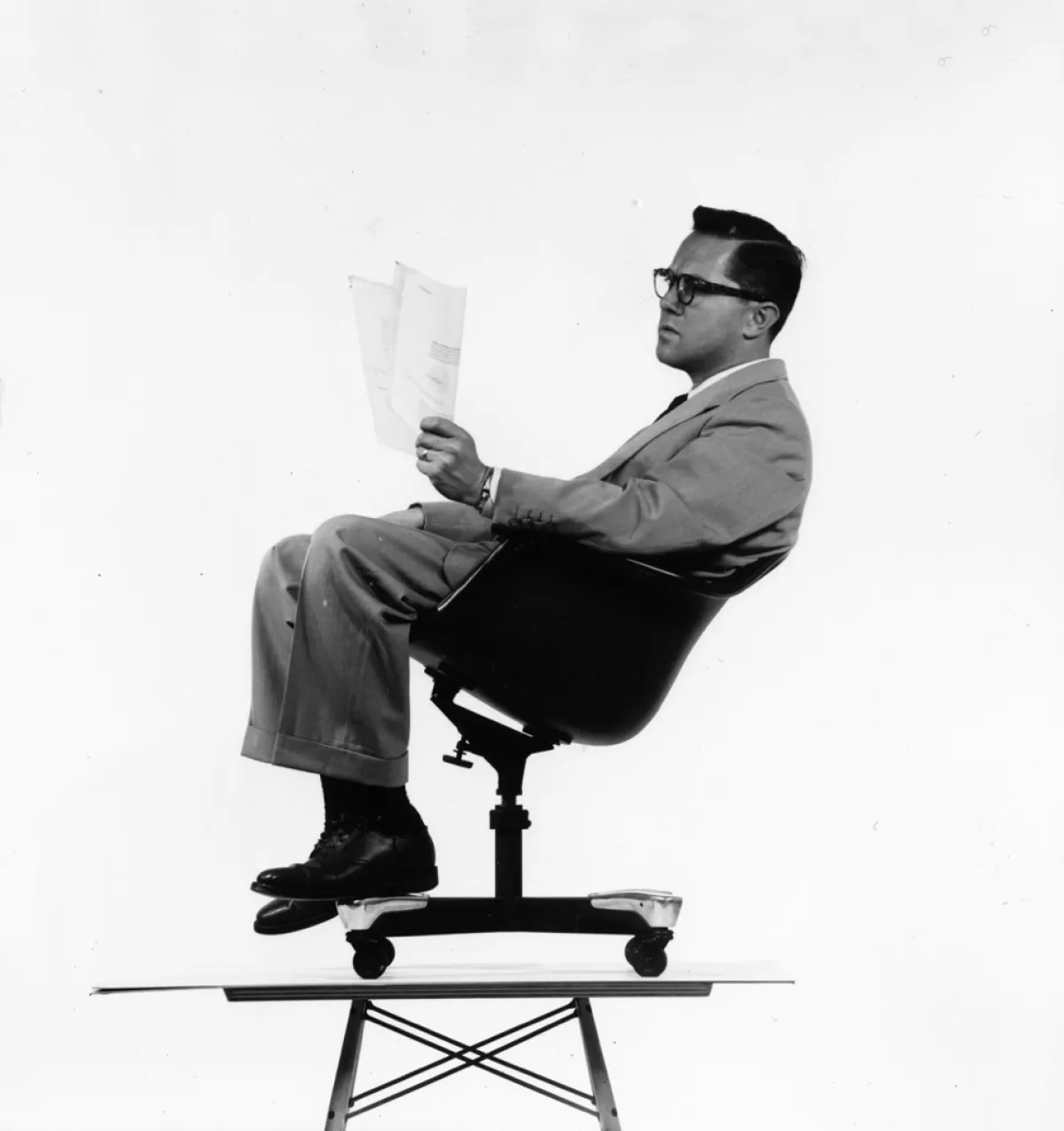 The exhibition features three Eames chairs that represent three different modes of sitting: the barstool, the lounge chair, and the office chair. Historical images and artifacts from the Eames archive provide additional context for these iconic designs, showcasing the popularity and impact of these chairs through a visual history. All objects featured in the exhibition have been generously loaned to us by our friends at Herman Miller.