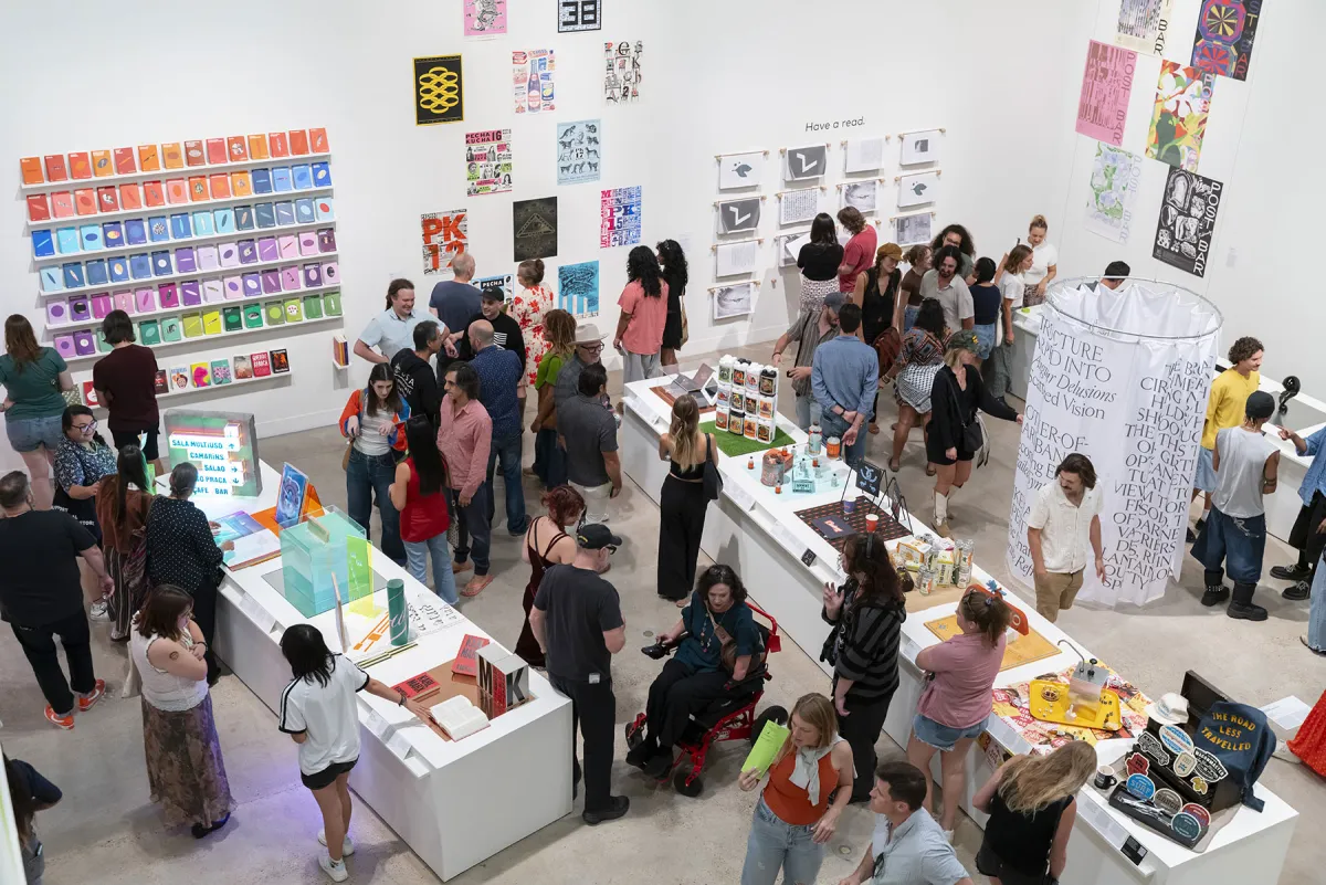 Opening reception for Hundred Points: Contemporary Graphic Design from Austin, São Paulo, Cairo, and Helsinki at the Visual Arts Center, September 26, 2025. Photo: Alex Boeschenstein.