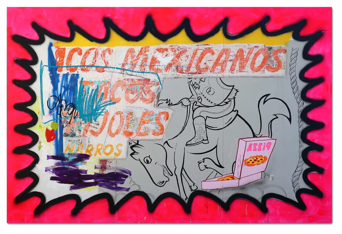 Cande Aguilar, Ni De Aqui Ni De Alla, 2019. Multimedia painting with transfers on panels. 96 x 144 in. Courtesy of the artist.