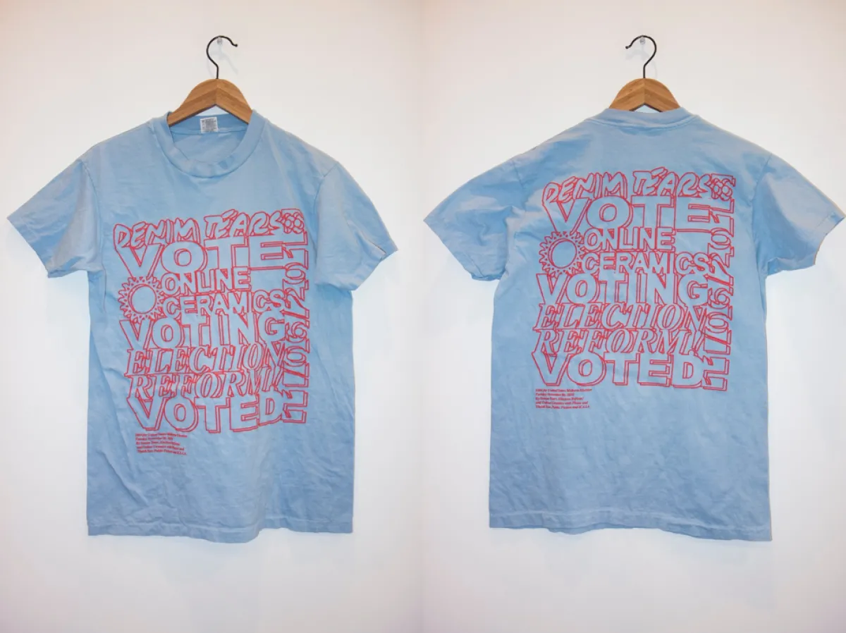 Shirt for United States Midterm Election Tuesday November 06, 2018 Made by Denim Tears, Election Reform! and Online Ceramics with Please and Thank You, Public Fiction and ICA LA, 2018. Red puff ink on custom blue garment dyed vintage white undershirt.