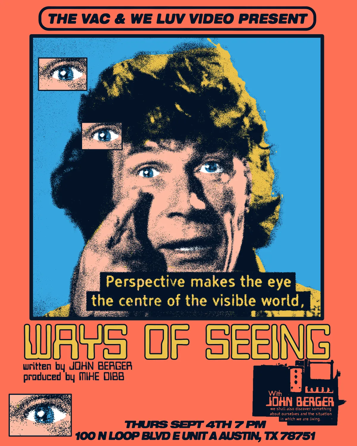 Join the Visual Arts Center and We Luv Video for a free screening of John Berger’s 1972 television series Ways of Seeing. In the beloved four-part series made for public broadcast, Berger invites people to join him in the act of looking at and thinking about art. He looks closely at oil paintings, portraits of women, and advertisements to clarify the arrangements of power, class, gender, and race behind works of art, and asks viewers to relate these arrangements to their own lives. The series was produced by Mike Dibb and adapted into a book of the same name.